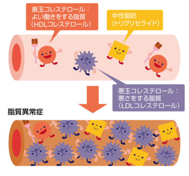 コレステロール値や中性脂肪値が高くなる脂質異常症が大きな原因だといわれています。