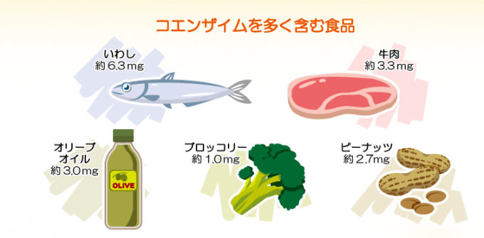 コエンザイムQ10の1日摂取目安量は、60~100mgとされています。コエンザイムQ10が多く含まれる食材は、牛肉、豚肉、レバーなどの肉類、いわしやさばなどの魚類、ほうれんそう、ブ...